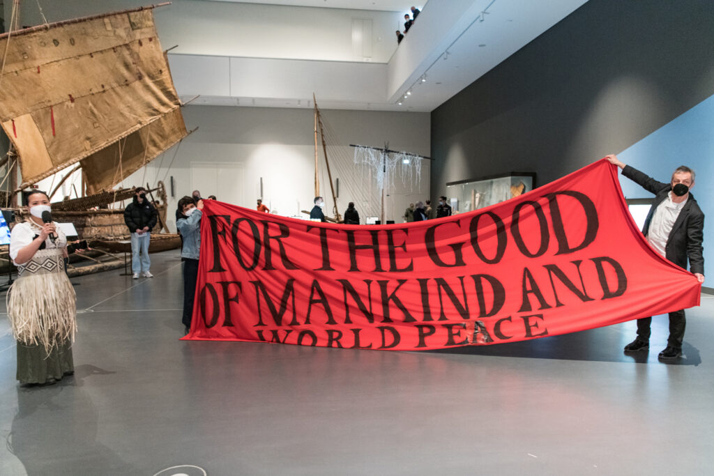 The empty space at „Oceania”, waiting for one last boat from the collection, was temporarily occupied by videos, sculptures, sound installations and temporary actions. The program started with a live stream between Berlin and the Marshall Islands and bridged a 10-hour gap with dances, speeches and a show round at the Humboldt Forum.